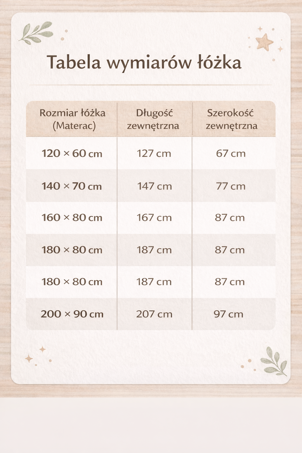 Poniższa tabela przedstawia porównanie rozmiaru łóżka (powierzchnia spania) z faktycznym miejscem, jakie łóżko zajmie w pokoju: